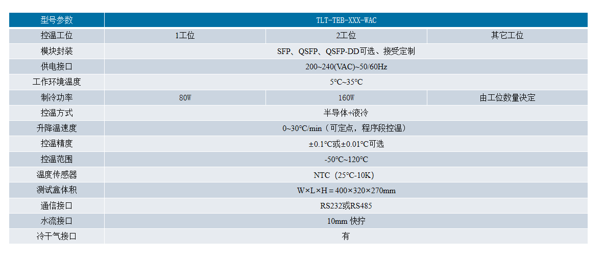 本系列的“雙工位測試盒”是建立在半導體制冷片(熱電制冷片)基礎上設計的高性能溫度控制系統(tǒng),其特點是高精度和高穩(wěn)定度、長壽命、體積小、無噪聲、無磨損、無振動、無污染、既可制冷又可加熱等優(yōu)點。 控溫速度快,溫度均勻性好,常溫25℃降至-45℃時間為小于150S,遙遙領先行業(yè)。該設備可以廣泛應用于光模塊、光器件及其組件、小型和微型化封裝的電子產品,在研發(fā)、生產環(huán)節(jié)的高低溫測試中。該儀器具備如下特點,能有效幫助企業(yè)提高生產效率、降低生產成本、提升產能。解決了當前行業(yè)通用方法/儀器應帶來的各種弊端和不足。